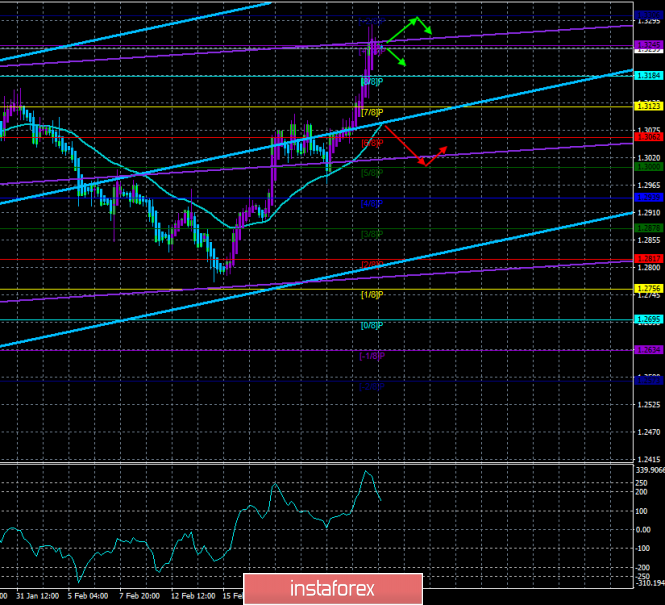 Валютная пара EUR/USD в среду, 27 февраля, совершила рывок вверх, после чего может начать нисходящую коррекцию. Вечернее выступление Джерома Пауэлла в Конгрессе можно назвать нейтральным. По крайней мере ничего сверхважного и интересного он не сообщил. Пауэлл отметил, что считает перспективы экономики благоприятными, однако признает, что за последние несколько месяцев ФРС столкнулась с рядом «противоречивых тенденций и сигналов».