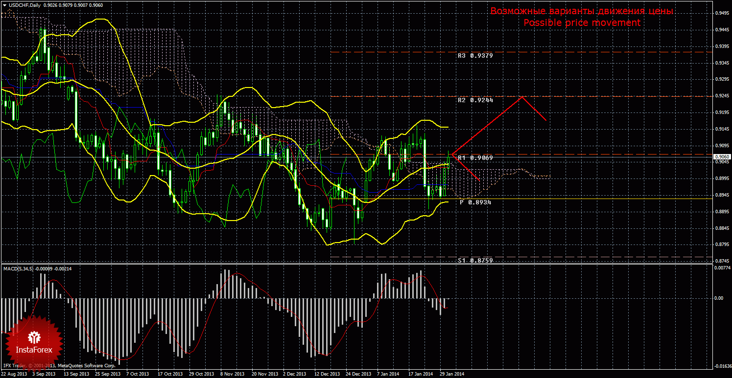 Франк на дневном таймфрейме скорректировался к линии Киджун-сен, завершил коррекцию и отработал первый уровень сопротивления 0,9069, выше которого пока не закрепился. Сигнал на покупку подтвержденный - Чинкоу Спан находится ниже графика цены и сильный, так как цена располагается выше облака Ишимоку. Первой целью восходящего движения сейчас является первый уровень сопротивления 0,9069, который уже отработан, но пока что не преодолен. Если цена преодолеет первый таргет, то новой актуальной целью для восходящего движения будет выступать второй уровень сопротивления 0,9244. Восходящее движение актуально до тех пор, пока цена находится выше Киджун-сен (0,8975), если цена закрепится ниже критической линии, то «золотой крест» ослабится, а дальнейшее восходящее движение будет поставлено под вопрос. Нисходящее движение может возобновиться с целью первый уровень поддержки 0,8759. Цена располагается выше линий Тенкан-сен и Киджун-сен, что свидетельствует о восходящем движении. Тенкан-сен направлен вниз, что говорит нам о нисходящем движении в краткосрочном плане. Киджун-сен направлен наверх, что свидетельствует о том, что восходящее движение преобладает в более долгосрочном плане. Чинкоу Спан располагается выше графика цены, что является подтверждением текущему сигналу на покупку и означает бычье настроение валютных трейдеров. Облако Ишимоку свидетельствует об усилении импульса восходящего движения, оно направлено вверх и сужается. Отскок цены от уровня 0,9069 может спровоцировать возобновление нисходящей коррекции.