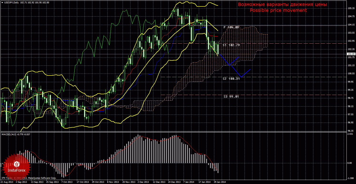 По иене на прошедшей неделе цена продолжила нисходящее движение, сформировался новый «мертвый крест», а цена закрепилась внутри облака Ишимоку. Текущий сигнал на продажу является подтвержденным и слабым, так как Чинкоу Спан находится ниже графика цены, а цена в свою очередь располагается внутри облака Ишимоку. Первой целью нисходящего движения выступает нижняя граница облака Ишимоку. Если цена преодолеет первый таргет, то новой актуальной целью будет выступать второй уровень поддержки 100,31. Нисходящее движение будет актуальным до тех пор, пока цена находится ниже Киджун-сен (103,60), если цена закрепится выше критической линии, то восходящее движение может попытаться продолжиться с целью первый уровень сопротивления 106,57, а сигнал на продажу ослабится и шорты перестанут быть актуальными. Цена находится ниже линий Тенкан-сен и Киджун-сен, что указывает на текущее нисходящее движение. Тенкан-сен направлен вниз, что говорит нам о нисходящем движении в краткосрочном плане. Киджун-сен также направлен вниз, что свидетельствует о том, что нисходящее движение продолжается и в более долгосрочном плане. Чинкоу Спан находится ниже графика цены, что является подтверждением текущему сигналу на продажу и означает медвежье настроение трейдеров. Облако Ишимоку направлено вверх и сужается, что свидетельствует о восходящем уклоне движения и о его ослаблении. Отскок цены от Сенкоу Спан Б может спровоцировать виток восходящей коррекции.