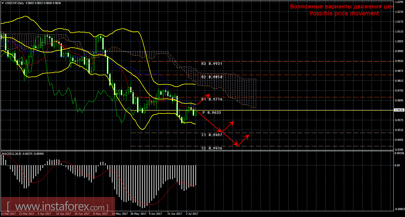 Швейцарский франк на дневном таймфрейме скорректировался к критической линии и не смог преодолеть эту линию, таким образом, коррекция моет быть завершена. Текущий сигнал на продажу подтвержденный и сильный. Целями для нисходящего движения на данный момент являются уровни поддержки 0,9497 и 0,9416. Нисходящее движение сейчас не актуально, так как цена располагается ниже линии Киджун-сен (0,9660), если цена закрепится выше этой линии, то текущий сигнал будет ослаблен, а движение вниз потеряет свою актуальность, как и короткие позиции, а восходящее движение сможет продолжиться с целью уровень сопротивления 0,9850. Индикатор MACD указывает на восходящую коррекцию, однако, он сначала опоздал к началу коррекции 30 июня, после чего опоздал к ее завершению около линии Киджун-сен. Боллинджер Бандс указывает на сохранение перспектив нисходящего движения, так как полосы немного расширяются и направлены вниз. В Швейцарии на следующую неделю не запланировано никаких важных экономических новостей. Таким образом, наиболее интересные новости поступят из Америки, в пятницу (инфляция, розничные продажи, промышленное производство).