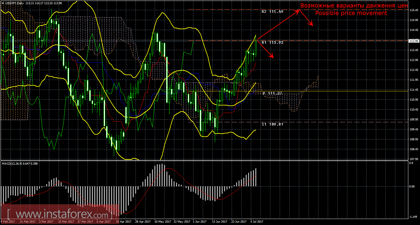 По валютной паре USD/JPY продолжается движение вверх. Первым таргетом для покупок выступает уровень 113,93, вторым - 115,49. Стоп-лосс рекомендуется выставлять ниже 111,45 и по мере повышения этой линии подтягивать вверх и стоп-лосс. Закрывать вручную ордера на продажу можно будет при отскоке цены от уровня 113,93 или при развороте индикатора MACD вниз. При профитности длинных позиций 150-200 пунктов, стоп-лосс рекомендуется переносить в безубыток. Ордера тейк-профит можно располагать ниже целевых уровней, на 10 – 20 пунктов. Ордера на продажу сейчас не актуальны.
