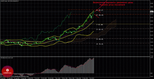 По валютной паре USD/JPY в данный момент продолжается восходящий тренд. Первым таргетом для торговли на повышение является 89,97. В случае преодоления этой цели, следующим таргетом будет 93,27. Стоп-лосс рекомендуется выставлять ниже 85,60 и по мере повышения этой линии подтягивать вверх и стоп-лосс. Сокращать длинные позиции можно в случае разворота MACD вниз (при аналогичном развороте вниз и цены) или отскока цены от уровня 89,97. При профитности длинных позиций 60-70. Тейк-профиты можно выставлять немного ниже целевых уровней – 89,85 и 93,15.
