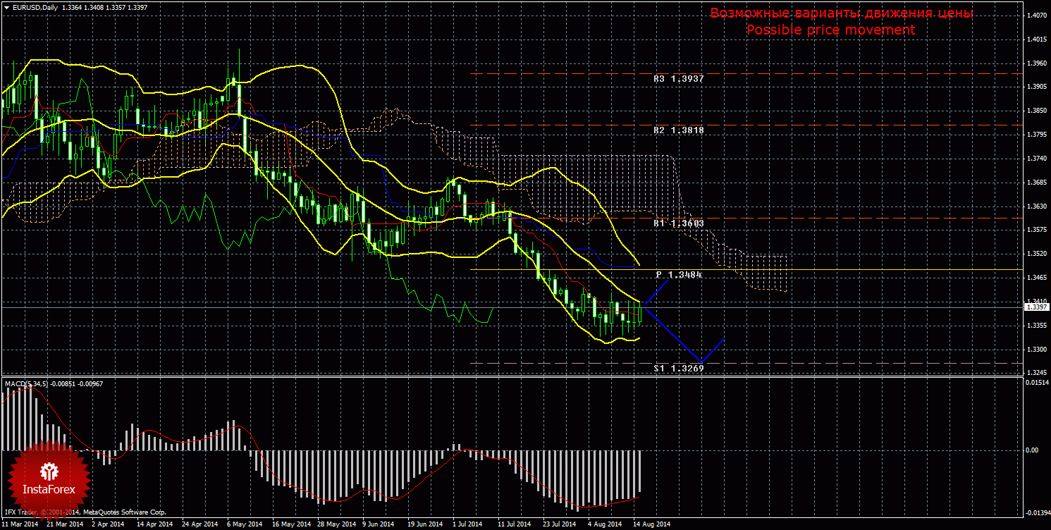 Евро на дневном таймфрейме корректируется, но коррекция на данный момент боковая, которая может перерасти в восходящую с целью линия Киджун-сен. Текущий сигнал на продажу подтвержденный - Чинкоу Спан находится ниже графика цены и сильный, так как цена располагается ниже облака Ишимоку. Первой целью нисходящего движения является первый уровень поддержки 1,3269. В случае преодоления первой цели, следующим таргетом для нисходящего движения будет выступать второй уровень поддержки 1,3150. Нисходящее движение будет актуальным до тех пор, пока цена находится ниже Киджун-сен(1,3485), если цена закрепится выше критической линии, то восходящее движение может попытаться продолжиться с целью первый уровень сопротивления 1,3603, сигнал на продажу будет ослаблен и может отмениться, а короткие позиции потеряют свою актуальность. Цена располагается между линий Тенкан-сен и Киджун-сен, что свидетельствует о текущем коррекционном движении. Тенкан-сен направлен вниз, что говорит нам о нисходящем движении в краткосрочном плане. Киджун-сен также направлен вниз, что свидетельствует о сохранении нисходящего движения и в среднесрочной перспективе. Чинкоу Спан находится ниже графика цены, что является подтверждением текущему сигналу на продажу и означает медвежье настроение трейдеров. Облако Ишимоку свидетельствует о нисходящем движении, оно направлено вниз и немного расширяется, что свидетельствует об усилении нисходящего импульса.