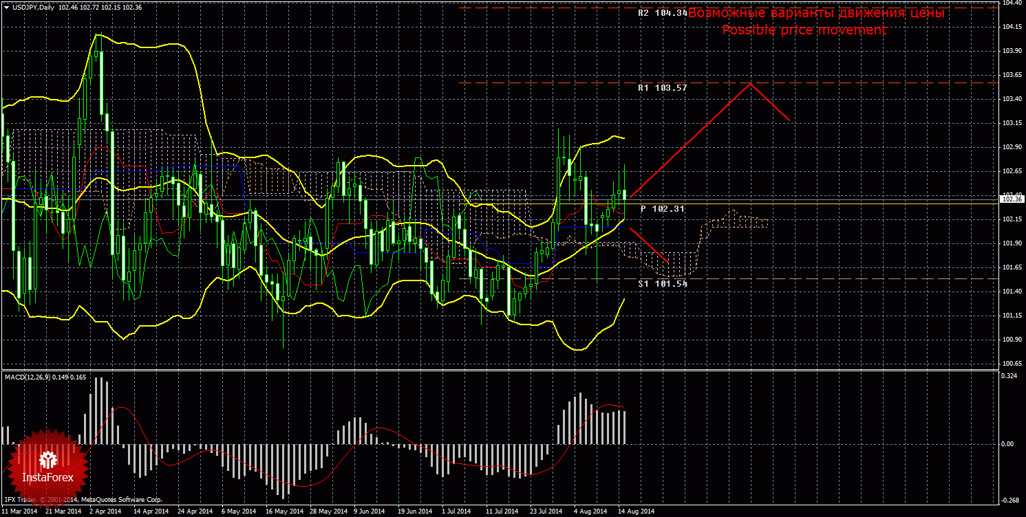 По валютной паре USD/JPY может возобновиться восходящее движение. Первой целью для длинных позиций выступает уровень 103,57. Вторым таргетом является уровень сопротивления 104,34. Стоп лосс рекомендуется выставлять ниже 102,10 и по мере повышения этой линии подтягивать вверх и стоп лосс. Открывать новые ордера на покупку можно будет в случае отскока цены от критической линии(выполнено) или при развороте индикатора MACD наверх. При профитности длинных позиций 100-. Ордера тейк профит можно выставлять чуть ниже целевых уровней – 103,45 и 104,20.