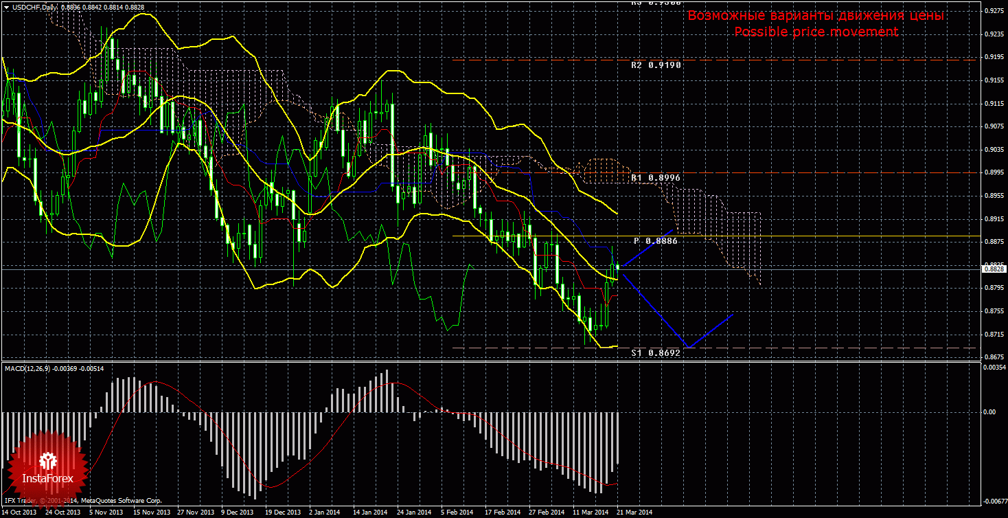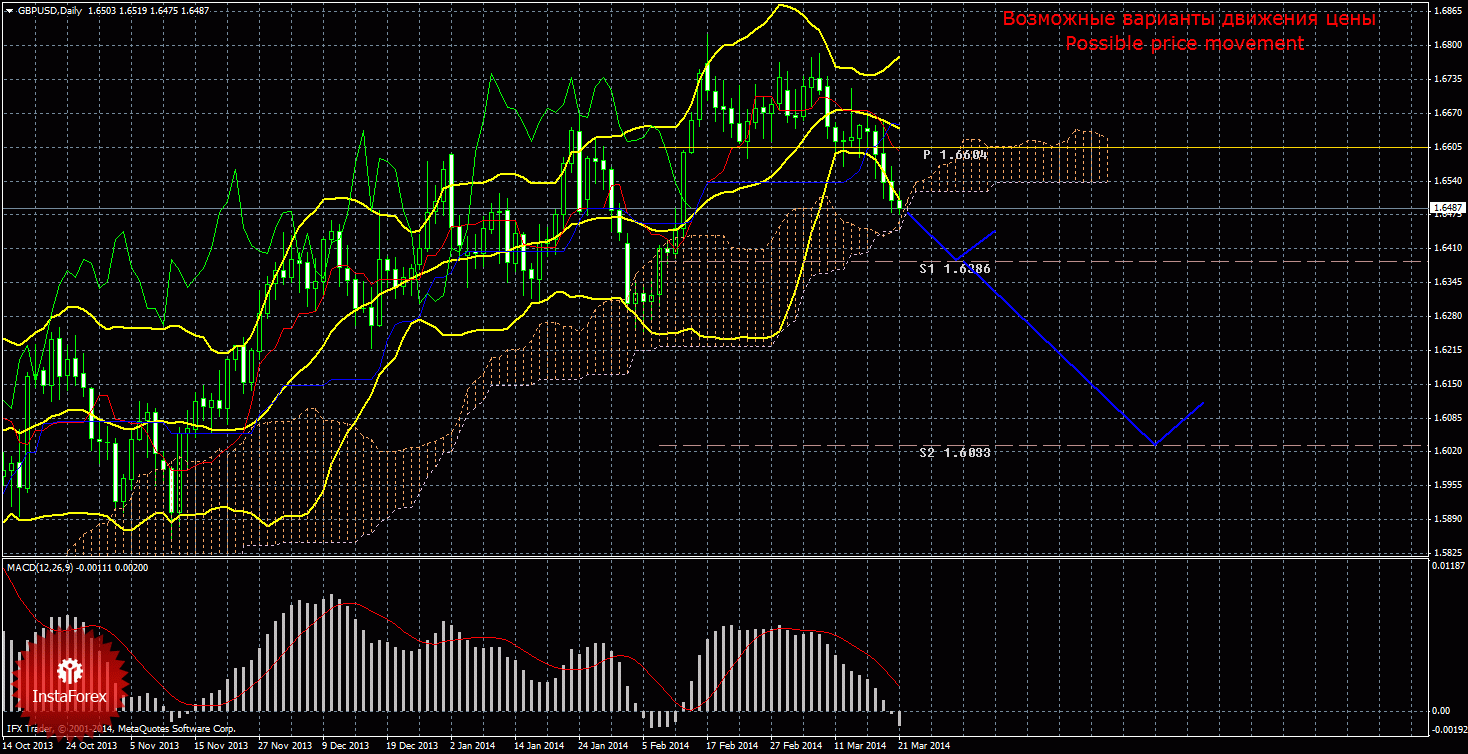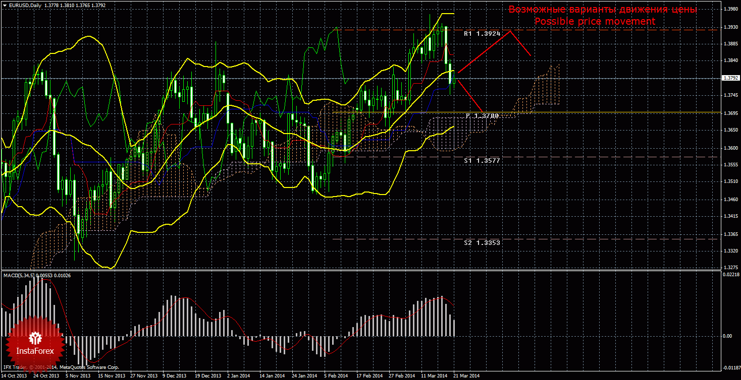 Евро на дневном таймфрейме не сумел преодолеть первый уровень сопротивления, отскочил от него и начал коррекционное движение, отработав критическую линию. Текущий сигнал на покупку подтвержденный - Чинкоу Спан находится выше графика цены и сильный, так как цена располагается выше облака Ишимоку. Первой целью восходящего движения является первый уровень сопротивления 1,3924, который уже был достигнут. В случае преодоления первой цели, следующим таргетом для восходящего движения будет выступать второй уровень сопротивления 1,4047. Восходящее движение будет актуальным до тех пор, пока цена находится выше Киджун-сен(1,3800), на данный момент цена закрепилась ниже критической линии, поэтому нисходящее движение может продолжиться с целью пивот-уровень 1,3700, сигнал на покупку ослаблен и может отмениться, а длинные позиции потеряли свою актуальность. Цена располагается ниже линий Тенкан-сен и Киджун-сен, что свидетельствует о текущем коррекционном движении. Тенкан-сен направлен вниз, что говорит нам о нисходящем движении в краткосрочном плане. Киджун-сен направлен вверх, что свидетельствует о сохранении восходящего движения в среднесрочной перспективе. Чинкоу Спан находится выше графика цены, что является подтверждением текущему сигналу на покупку и означает бычье настроение трейдеров. Облако Ишимоку свидетельствует о восходящем движении, оно направлено вверх и расширяется, что свидетельствует об усилении восходящего импульса. Если цена закрепится выше линии Киджун-сен, то восходящее движение может возобновиться.