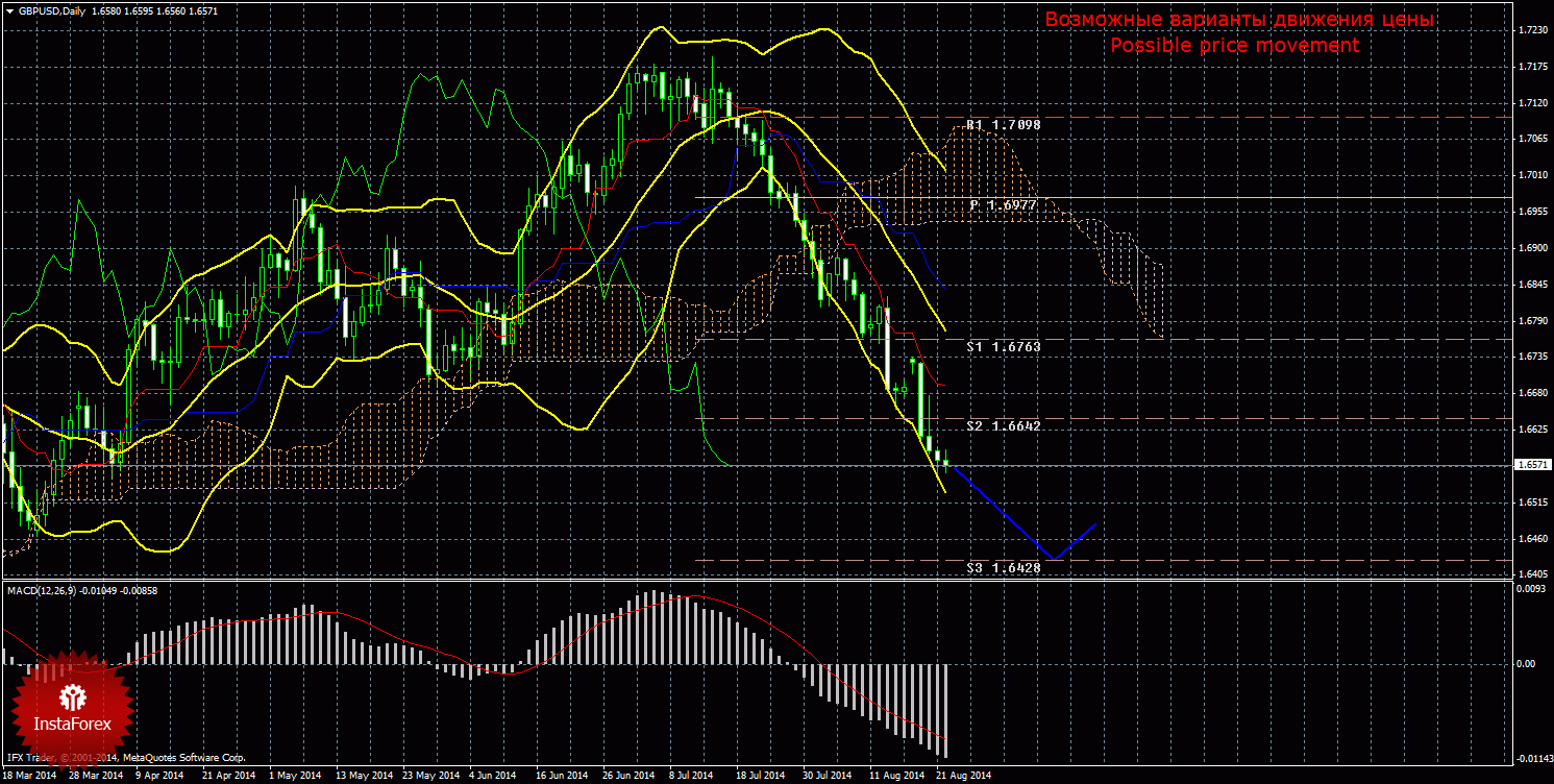 Евро на дневном таймфрейме возобновил нисходящий тренд и закрепился ниже первого уровня поддержки 1,3269. Текущий сигнал на продажу подтвержденный - Чинкоу Спан находится ниже графика цены и сильный, так как цена располагается ниже облака Ишимоку. Первой целью нисходящего движения является второй уровень поддержки 1,3150. В случае преодоления первой цели, следующим таргетом для нисходящего движения будет выступать третий уровень поддержки 1,2935. Нисходящее движение будет актуальным до тех пор, пока цена находится ниже Киджун-сен(1,3385), если цена закрепится выше критической линии, то восходящее движение может попытаться продолжиться с целью верхняя граница облака Ишимоку, сигнал на продажу будет ослаблен и может отмениться, а короткие позиции потеряют свою актуальность. Цена располагается ниже линий Тенкан-сен и Киджун-сен, что свидетельствует о текущем нисходящем движении. Тенкан-сен направлен вниз, что говорит нам о нисходящем движении в краткосрочном плане. Киджун-сен также направлен вниз, что свидетельствует о сохранении нисходящего движения и в среднесрочной перспективе. Чинкоу Спан находится ниже графика цены, что является подтверждением текущему сигналу на продажу и означает медвежье настроение трейдеров. Облако Ишимоку свидетельствует о нисходящем движении, оно направлено вниз и немного расширяется, что свидетельствует об усилении нисходящего импульса.