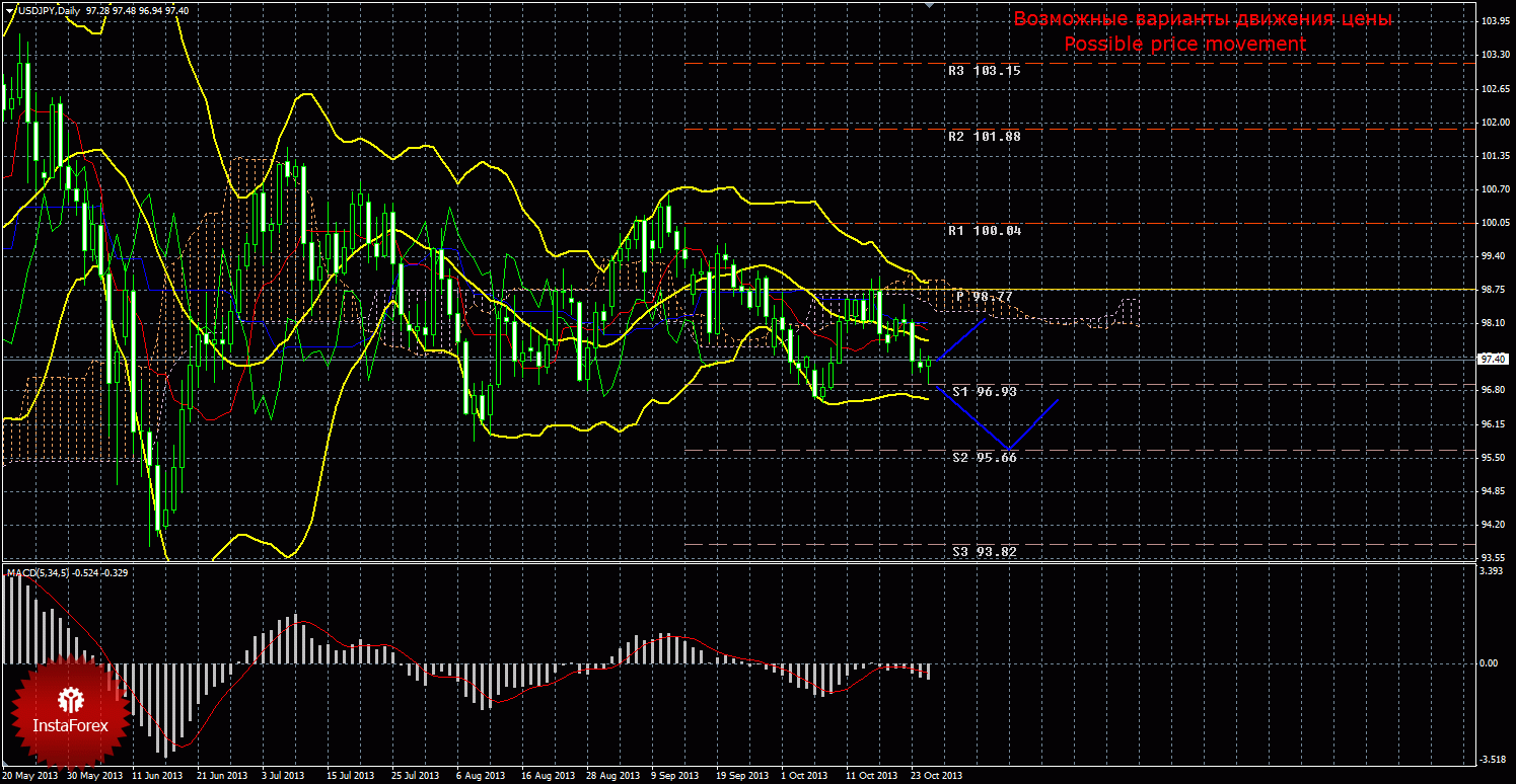 По валютной паре USD/JPY пока что нисходящее движение. Первым таргетом для торговли на понижение является 96,93. Второй целью, в случае преодоления первой, будет выступать уровень 95,66. Стоп-лосс рекомендуется выставлять выше 98,10 и по мере понижения этой линии подтягивать вниз и стоп-лосс. Сокращать шорты можно будет в случае разворота MACD вверх или при отскоке от уровня поддержки 96,93 (выполнено). При профитности длинных позиций 60-70. Тейк-профиты можно выставлять немного выше целевых уровней – 97,05 и 95,75.