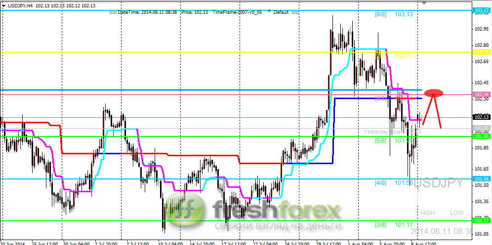 11 августа 2014, USD/JPY. От уровня (4/8) развивается восходящая коррекция.