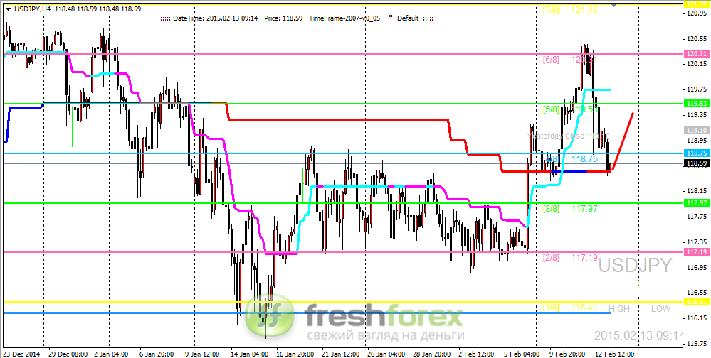 13 февраля 2015, USD/JPY. Подошли к сильной области поддержки.