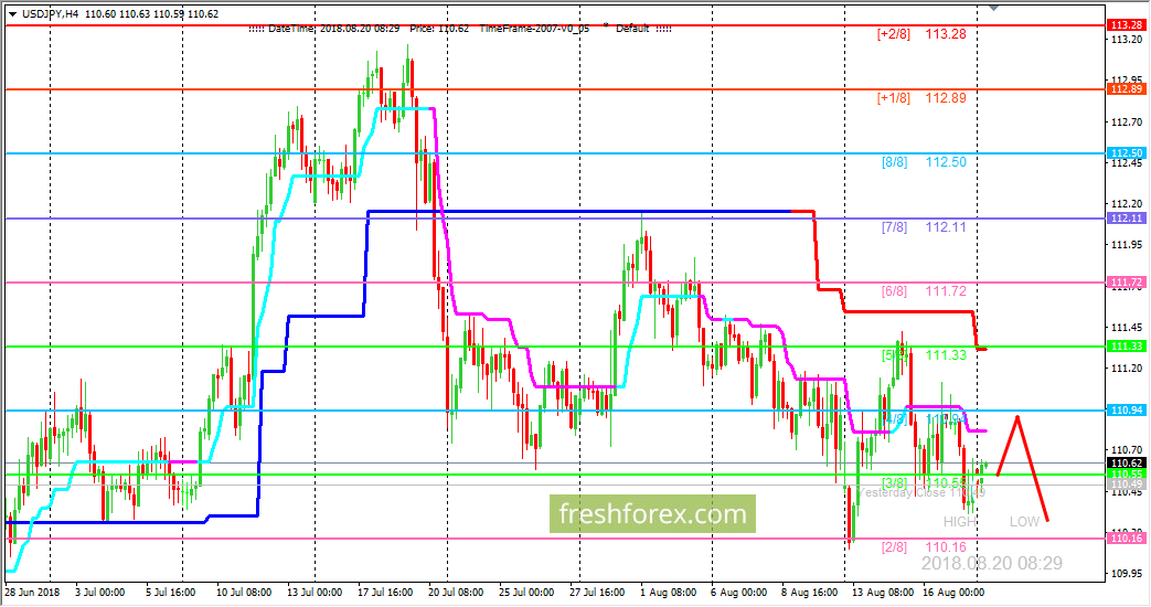 Четырехчасовой график USD/JPY. От главного уровня поддержки/сопротивления 110.94 (4/8) валютная пара возобновила движение вниз продавив уровень 110.55 (3/8), что для нас стало сигналом выхода цены из боковика (3/8 – 5/8). Но пока цене не удалось закрепиться ниже уровня (3/8), поэтому с текущих уровней можно ожидать роста котировок с целью ретеста уровня (4/8), откуда движение вниз с большой вероятностью должно возобновиться. Отменен данный сценарий будет в случае закрепления цены выше главного уровня поддержки/сопротивления 110.94 (4/8).