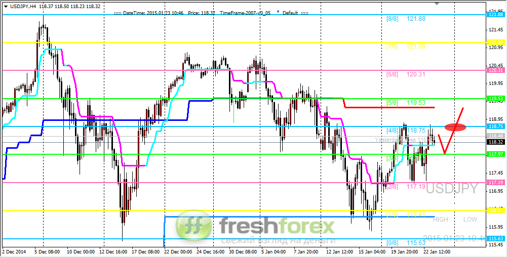 23 января 2015, USD/JPY. Давление на уровень (4/8) сохраняется.
