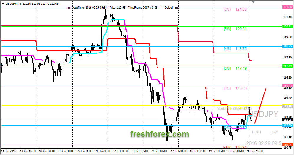 29 февраля 2016, USD/JPY. Уровень (0/8) продолжает удерживать цену.