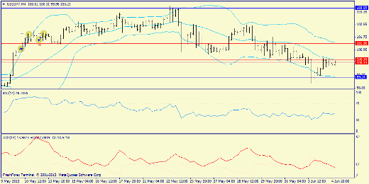 4х-часовой график: пара вплотную подошла к средней Боллинджера (100.34). Учитывая пробитый конверт под ногами и падающий ADX, можно предположить, что более вероятен южный вариант развития дальнейших событий (снижение от 100.34 к 99.24). В том случае, если 100.34 будет сломлен быкам, то целью станет верхняя полоса (101.36)