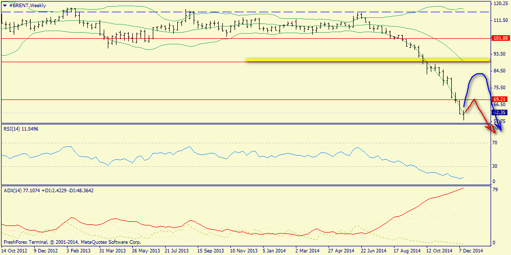 Недельный график: абсолютно аналогичная ситуация - сильное медвежье давление при перепроданном осцилляторе. Вопросом здесь является уровень возможной коррекции. Этим уровнем может стать дневная средняя Боллинджера (69.21, красная стрелка), либо же недельная средняя (90.00, синяя стрелка). При формировании локальных шорт-сигналов от указанных уровней можно продолжать достаточно уверенно продавать Брент к целям 54.48 и 51.87.