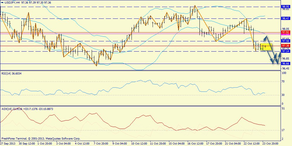 Н4: массивная консолидация с явным зауживанием и подготовкой к импульсу. По-прежнему доминируют медведи, поэтому мы можем ждать либо прямой выброс цены к поддержке 96.66, либо предварительный откат к средней Боллинджера (97.86).