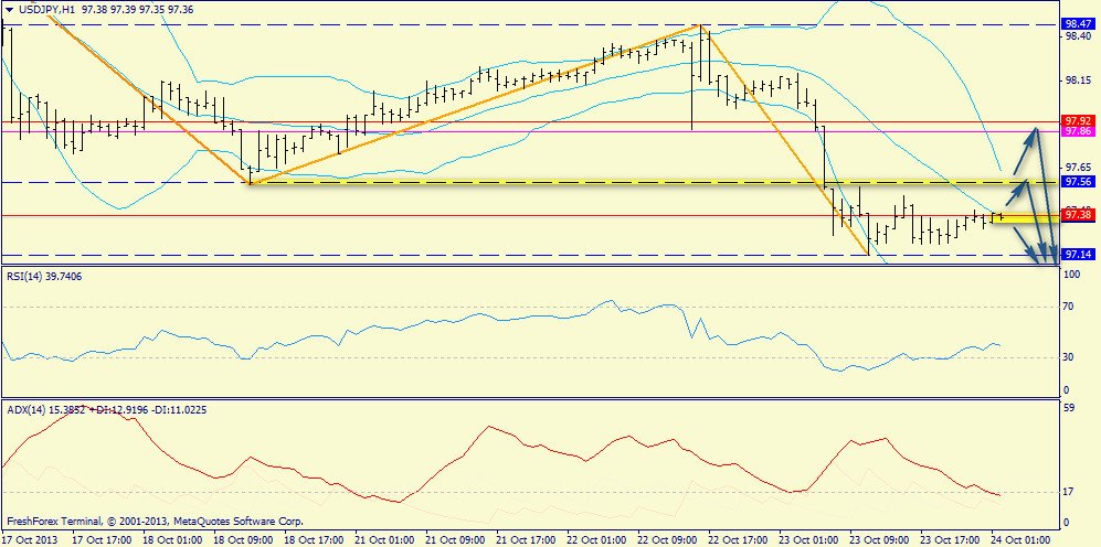 Часовой график: три сопротивления на пути (97.38, 97.56, 97.86), от каждого из которых продавцы могут начать продавливание к 96.66. Альтернатив почти не видно.