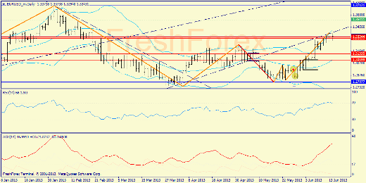Недельный график: итак, здесь все достаточно однозначно - трендовое движение на повышательном ADX находится уже в верхнем конверте, поэтому на 99% можно ожидать, что пара достигнет верхней полосы (1.3541). В том случае, если данный уровень так же не сдержит быков, то мы увидим и 1.3712.