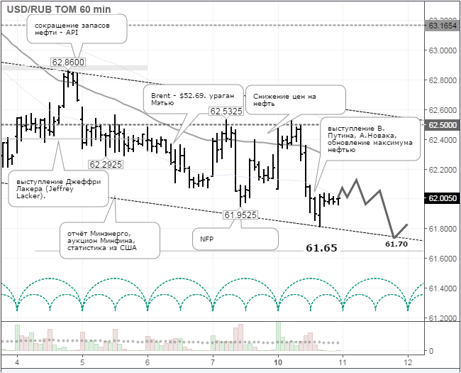 Если цена на нефть закрепится выше отметки $53,80, то курс доллара отправится к уровню 60,80 руб. Если курс доллара достигнет его к концу недели, значит с 17 октября идём тестировать психологический уровень 60 руб. Если сопротивление $53,80 по нефти устоит, во что верится с трудом, то по рублёвым парам начнётся коррекционная фаза.