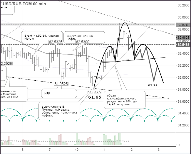 Пока пара доллар/рубль торгуется ниже отметки 63,00 руб., я буду рассматривать его укрепление против иностранных валют. В Азии нефть торгуется в плюсе. Южноафриканский ранд укрепился к доллару на 0,38%, до 14,29 за доллар. Торги на Московской бирже откроются снижением по валютам. По доллару ожидаю возвращение курса к уровню 61.95 руб., по евро – до 68,95 руб.