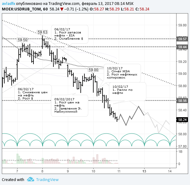 Что касается сегодняшнего дня, то по паре доллар/рубль ожидаем коррекцию к трендовой линии в район 58,44 руб., во вторник – снижение до 58 руб. Прогноз на два дня, но завтра в любом случае его придется корректировать.