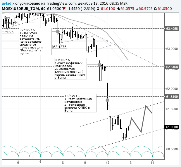 Дальнейшая динамика рубля по-прежнему будет определяться ценами на нефть. После встреч ОПЕК нефть сохранит «бычий» тренд, а значит, сохранится тенденция к укреплению рубля. Дорогой рубль не нужен Минфину, но не стоит так волноваться. Рублёвая стоимость барреля Brent составляет 3400 руб. Это значительно выше стоимости 2700 руб. заложенной в бюджет на 2017 год.