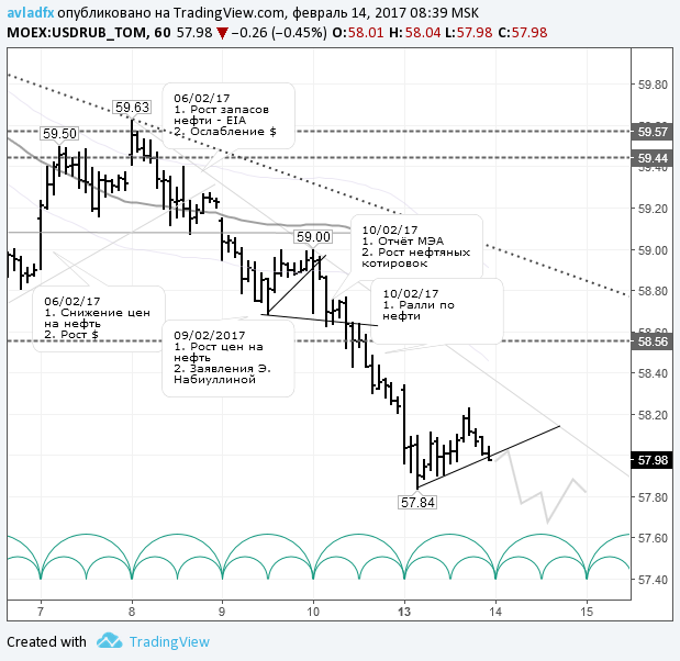 Сегодня, 14 февраля, нефть сорта Brent торгуется по $55,62 (+0,16%). В рублях бочка нефти стоит 3233 руб. На текущий момент уровень 3180 является хорошей поддержкой. Если она не устоит, цена на бочку снизится до 3065 руб. Сколько тогда будет стоить доллар? При снижении цен на нефть до $53,50 доллар подешевеет до 57,28 руб. Если нефть останется на текущем уровне $55,75, то курс доллара составит 54,97 руб.