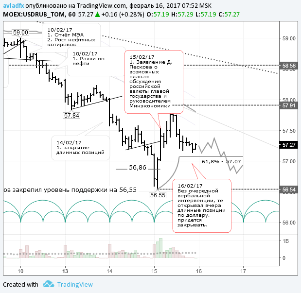Сегодня, 16 февраля, за нефть дают $55,71 (+0,13% к предыдущему закрытию). Минэнерго США в среду сообщило, что запасы нефти в стране за неделю увеличились на 9,5 млн баррелей. Цена снизилась незначительно и остаётся выше $55 за баррель. Если не снижается, значит, при удобном случае вырастет.