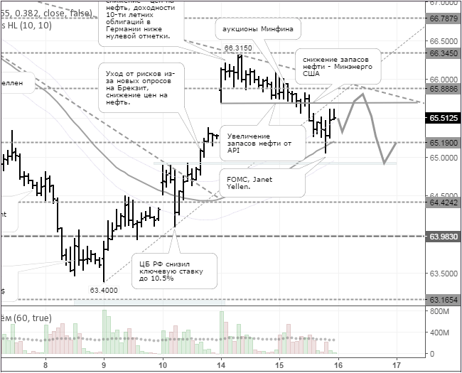 После выхода данных по запасам нефти курс доллар/рубль пробил трендовую линию. После заседания ФРС США цена снижалась до уровня 65,06 руб. Торговая сессия закрылась на отметке 65,51 руб. Отскок вверх был вызван снижением цен нефть и коррекцией по другим основным парам с долларом США.