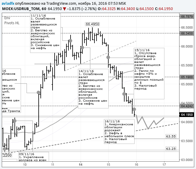 Если нефтетрейдерам удастся сегодня поднять цены выше $47,50, значит, от курса доллара ждём падения до 63,85 руб. (трендовая линия). При агрессивных продажах доллара – до 63,50/55 руб. Налоговый период и аукционы Минфина будет поддерживать рубль в первой половине дня.