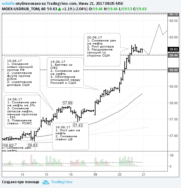 В настоящее время динамика цен на нефть остаётся главным драйвером для курса рубля. Нет роста нефтяных котировок – нет роста курса рубля. Давление на нефть сохранится до выхода отчета Минэнерго США. К этому времени курс доллара может протестировать уровень 60 руб., курс евро – 66,75 руб. Следующими целевыми для валют выступят уровни 60,65 руб. и 67,50 руб. соответственно.