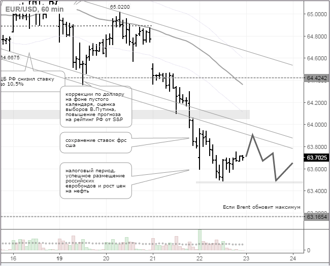 По прогнозу я жду снижение курса доллара до вчерашнего минимума 63,49 рубля. Если цена на Brent превысит уровень $47,80, то на общем ослаблении доллара цель можно сдвинуть на уровень 63,16 рубля. Перед выходными после 19 часов (gmt +3) возможен отскок цены. Пара евро/рубль сохранит динамику в диапазоне 71,25 – 71,90 руб.