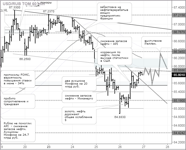 Сегодня внимание участников рынка будет приковано к выступлению председателя ФРС США Дж.Йеллен. Трейдеры хотят услышать от неё намёки на дальнейшее ужесточение денежно-кредитной политики. В настоящее время фьючерсы на процентные ставки ФРС указывают, что вероятность повышения ставки в июне составляет 26% (была выше 30%), в июле – 56%.