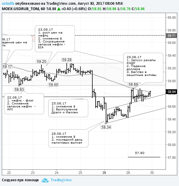 Что касается Brent, то цена остается торговаться в диапазоне $51,30–52,70 за баррель. Пока цена находится в указанных границах, у курса пары доллар/рубль будет возможность вернуться к уровню 58,34 руб. за доллар. В среду, 30 августа, по паре доллар/рубль ожидается консолидация в коридоре 58,58–59,00 руб., по паре евро/рубль – на уровне 70,60 руб. Для покупателей рубля хорошим знаком будет возвращение курса доллара к отметке 58,50 руб., плохим – к 59,00 руб.
