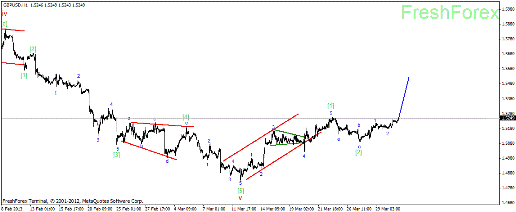 Евро продолжает радовать. Цена послушно последовало в том направлении в котором ожидалось и хочется верить что это еще не конец, так как потенциал к росту остается весьма и весьма неплохим. Чем же это обусловлено? Прежде всего стоит отметить, что нисходящий импульс предположительно завершился развитием конечного диагонального треугольника, а эта модель является сильным сигналом к завершению тренда и началу нового. Цена пока что подтверждает этот вариант развития событий и, предположительно, формирует восходящий импульс, в котором, в ближайшее время ожидается продолжение развития волны 3 восходящего импульсного движения.