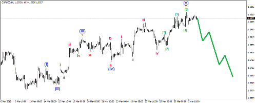 Коррекционный зигзаг, предположительно принял некрасивую форму зигзага, и завершился вчерашним сильным снижением. В данный момент наблюдается попытка пары возобновить рост, возможно зарождается восходящий импульс. Если это так, то в скором времени нас ожидает сильный импульсный рост пары.