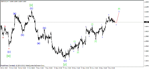 Пока так и до конца несовсем понятно что собирается делать данная пара. Импульсный рост вроде бы завершен, все волны на месте, однако быки неторопятся сдавать свой пост медведям, для того, чтобы на рынке появился адекватный ответ этому последнему восходящему импульсному движению. Пока цена будет находится внутри канала, можно лишь продолжать строить догадки насчет того, протяженная ли это горизонтальная коррекция, либо это зарождение нисходящего импульса с многочисленным чередованием волн 1-2, 1-2. Пока рассмотрим последий вариант. Возможно в данный момент начинается развитие волны 3 of [3] нисходящего импульса. Если это предположение верно, нас ожидает сильное импульсное снижение, дополнительным подтверждением будет пробой нижней границы канала.