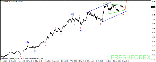 Наблюдаемый в данный момент коррекционный рост пары в виде тройного зигзага продолжает свое формирование. Как и указывалось в одном из вариантов предполагаемого развития событий пара в очередной раз начала движение вверх. Это объясняется не завершенностью модели. Теперь в дальнейшем нас очевидно ожидает продолжение роста пары, в ходе которого вся модель и примет окончательный вид и после этого начнется нисходящее импульсное снижение пары.