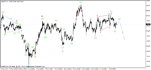 Предположительно в данный момент идет развитие волны [b] модели двойной зигзаг. Если это так, то в ближайшее время нас ожидает развитие коррекционного движения, после чего снижение пары возобновится.