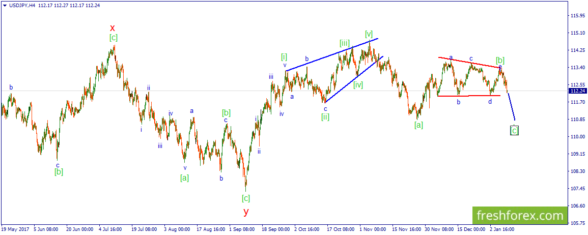 Японская валюта продолжила свое агрессивное наступление на американскую валюту. Это привело к еще более глубокому проседанию цены. И это вполне нормальное явление, так как ранее указывалось на завершение формирования коррекции в виде горизонтального треугольника, а наблюдаемое снижение, по всей видимости, это развитие волны [c], формирующегося зигзага.