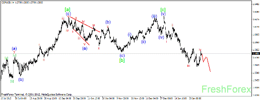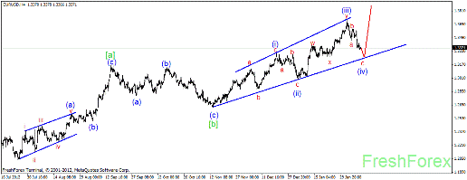 Рассмотрим четырехчасовой график движения пары EUR/USD. Здесь, предположительно идет формирование зигзага. Если быть более точным, то в данный момент, предположительно формируется волна [c], которая возможно принимает вид конечного диагонального треугольника. Общая волновая картина представлена ниже.