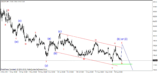 Предположительно в данный момент идет развитие коррекции. Коррекционная модель выглядит в виде плоскости. Если это предположение верно, то в ближайшее время нас ожидает возобновление нисходящего движения. Горизонтальной красной линией указан критический уровень, пробитие которой укажет на то, что волновую разметку нужно будет пересмотреть.