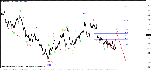 В данный момент очевидно что коррекция, развивавшаяся в виде плоскости оказалась незавершенной. Этим обуславливается мощный рывок пары вверх, в ходе которого, предположительно сформировалась волна c of [2]. Также этим рывком, была достигнута глубина коррекции, на графике видно, что она достигла уровня 61.8%. В дальнейшем же нас, предположительно ожидает снижение пары в импульсной форме.