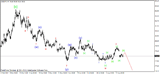 И все таки начал выполнятся альтернативный сценарий согласно которому коррекция приняла форму плоскости, где волна (с) формируется в импульсной форме, что собственно в данный момент и наблюдается. В дальнейшем же нас очевидно ожидает заключительный рывок цены вверх, после чего начнется затяжное снижение пары.