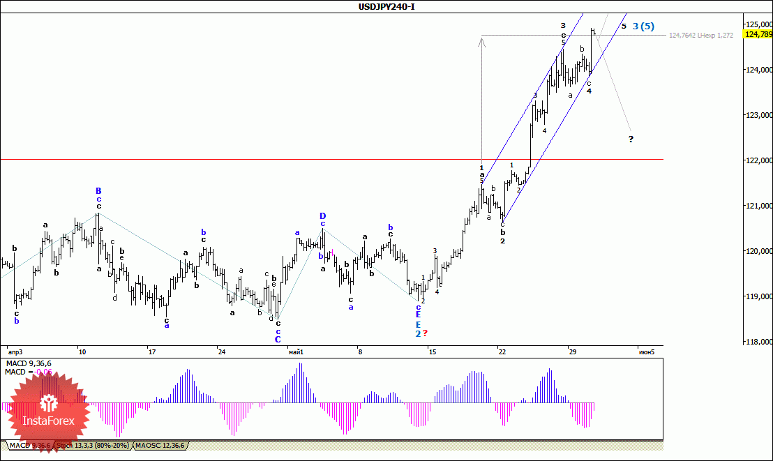 Как и предполагалось, завершив в несколько упрощенном виде формирование 4-й волны, в составе повышающего участка тренда, берущего начало от минимума 14 мая, пара USD/JPY возобновила восходящее движение и в конце минувшего дня остановилась в 9 б.п. от уровня 125 фигуры. Таким образом, в связи с отработкой первой расчетной цели для этого повышающего участка, валютная пара может начать снижение практически от достигнутого вчера максимума. В то же время возобновление восходящего движения может привести к росту котировок вплоть до уровня 128,00.