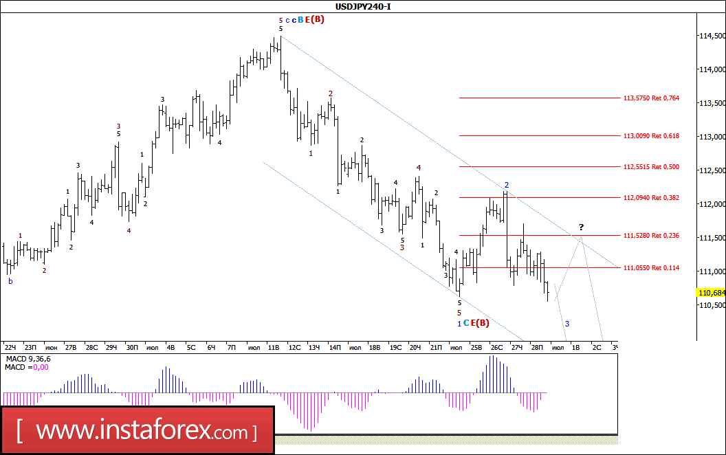 Начав пятничные торги с медленно развивающегося нисходящего движения, пара USD/JPY все же смогла пробить достигнутый 24 июля минимум и в конце дня отработать отметку 110,55. Таким образом, можно предположить, что валютная пара подтвердила переход в стадию формирования 3-й волны, в составе будущей C, в E, в (В), открывающий ей путь к уровням 109-й и даже 108-й фигуры. В то же время в сложившихся условиях сохраняется вероятность отката цены к верхней образующей линии наклонного коридора, в связи с чем 2-я волна, в C, в E, в (В) несколько усложнит свою волновую структуру.
