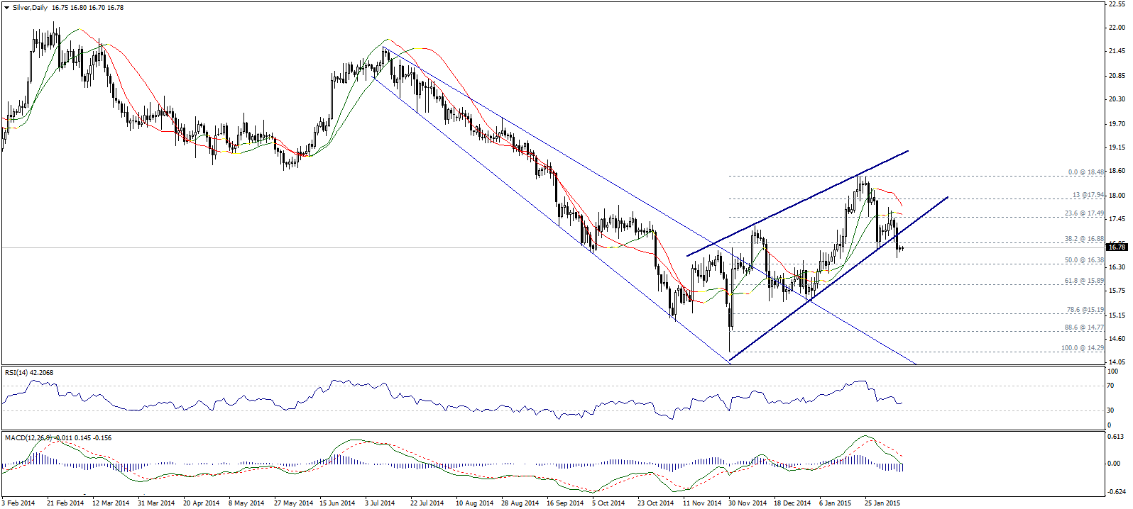 Серебро торгуется ниже уровня поддержки 16,88 (38,2% коррекции Фибоначчи), что сопровождается стабильностью ниже уровня поддержки восходящего канала. Эти факторы заставляют нас ждать продолжения нисходящего движения с целью 16,38 и возможно 15,89.