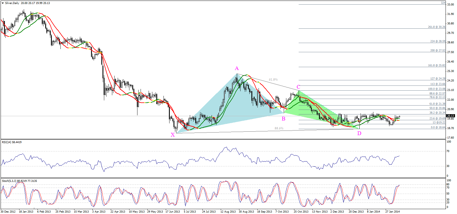 Серебро показывает положительную динамику закрепившись выше линий Линейной регрессии 34 и 55, что вновь возвращает влияние бычьего паттерна "Летучая мышь". Но на самом деле, пока металл не пробьет уровень 38,2% коррекции Фибоначчи (от движения CD) на 20,34 мы не можем подтвердить бычье движение, поэтому мы по прежнему предпочитаем оставаться вне рынка.
