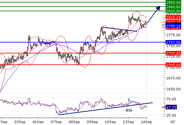 Наше предпочтение: ПОКУПАТЬ выше 2757 с целевыми точками 2830 и 2840.